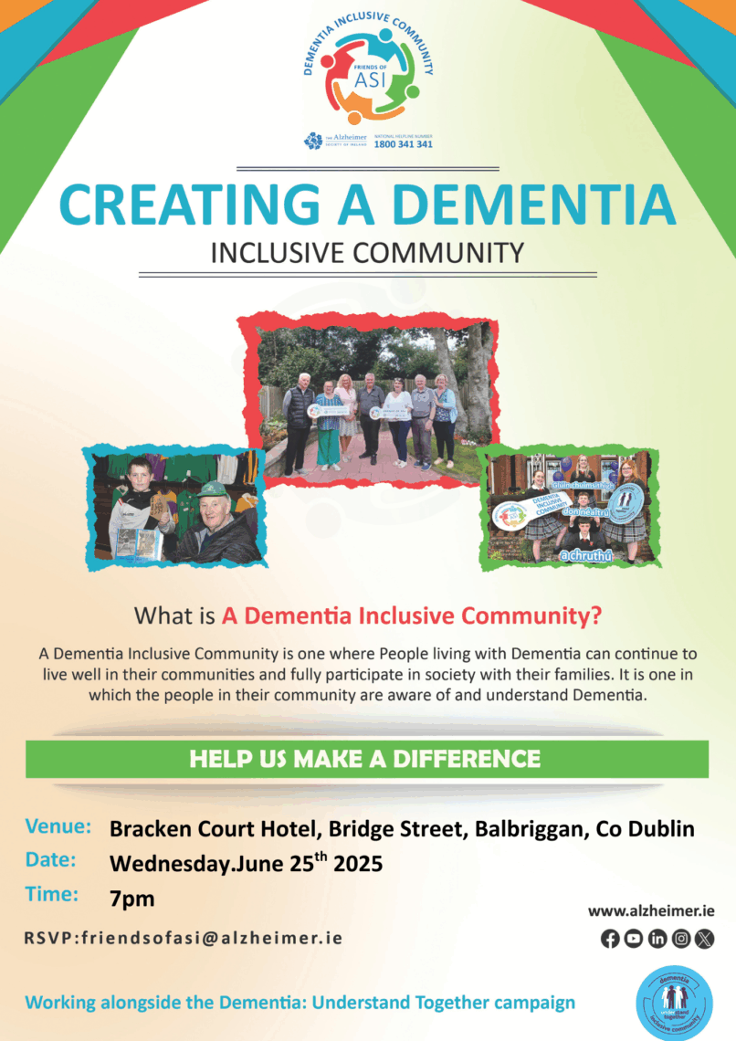 Local professionals, businesses, and community groups are invited to join the launch and building of a Dementia Inclusive Community in Balbriggan – where people living with dementia can continue to live well, stay active, and feel supported in their community.